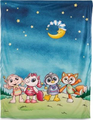 Diese kuschelweiche Plüschdecke “Schlafmützen” aus dem Hause NICI begeistert mit einem besonders schönen Design und eignet sich klasse für gemütliche Stunden. Auf der Decke sind die süßen Charaktere Pinguin Pingulini, Fuchs Finjo, Einhorn Fyala und Schaf Jolala zu sehen, wie sie sich über den Sternenhimmel freuen.